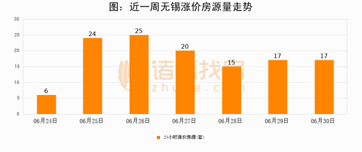 根据诸葛找房数据显示,无锡24小时涨价房源量为17套,较06月29日持平。