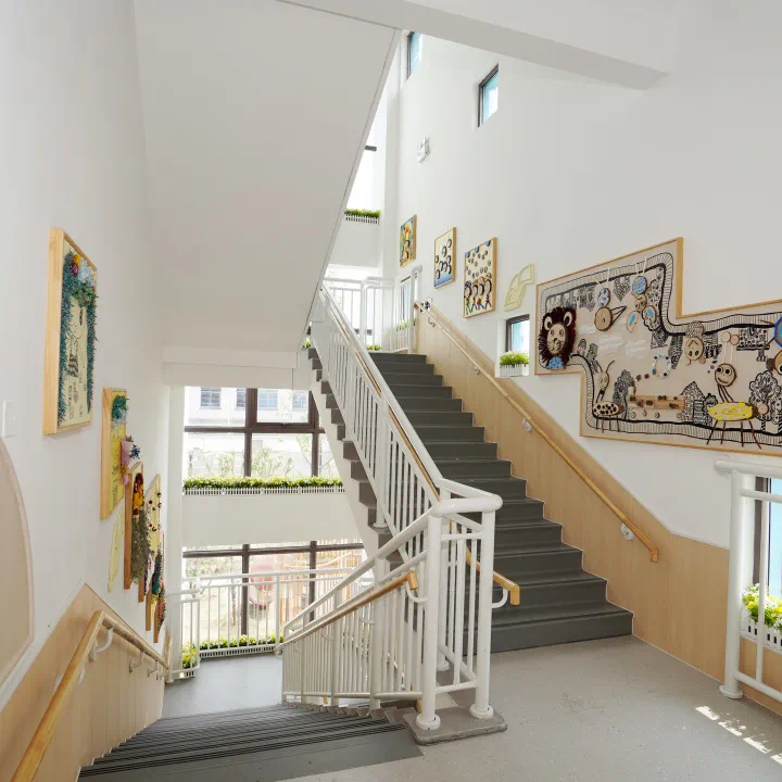 这里,所有的教室都采用了木制地板,木色为主并与其他色彩相间,墙上挂满了卡通绘画,充满童趣,看起来温馨而不失活泼。园区内设有融休闲、娱乐、锻炼于一体的“儿童活动乐园”,包括游戏设施、游戏场地、戏沙池、戏水池、动物饲养区、丛林探索区、种植园和塑胶跑道等。另建有艺术长廊、建构长廊、科技长廊、生活体验馆、创客木工房等,让每个入园的孩子都能得到健康、和谐、富有个性的 发展。