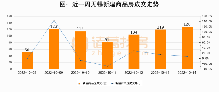 根据无锡市房地产市场管理和监测中心数据显示,2022年10月14日无锡新建商品房成交128套,较昨日增加9套,环比上涨7.6%
