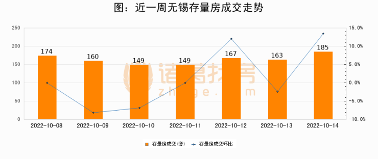 从存量房来看,2022年10月14日无锡存量房单日成交185套,比昨日增加22套,环比上涨13.5%。从近一周存量房成交来看,无锡存量房日均成交套数为163套,其中10月14日成交量较高为185套,10月14日单日成交185套,高于近一周平均水平13.5%。