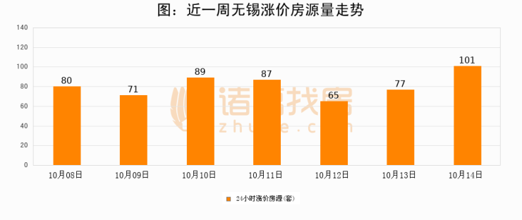 根据诸葛找房数据显示,无锡24小时涨价房源量为101套,较10月13日增加24套,环比上涨31.2%。与此同时,涨价房源占比小幅扩大,业主信心有所提升。