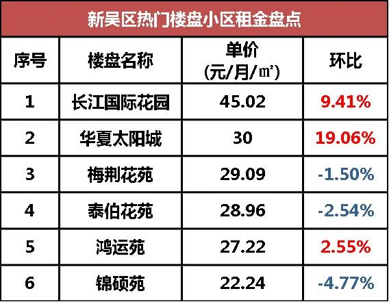新吴区5月平均租房单价为30.81元/㎡/月,在市区行政区中位列排名前列。其中老牌小区长江国际花园是新吴区平均租金单价较高的小区,达到了45.02元/㎡/月。
