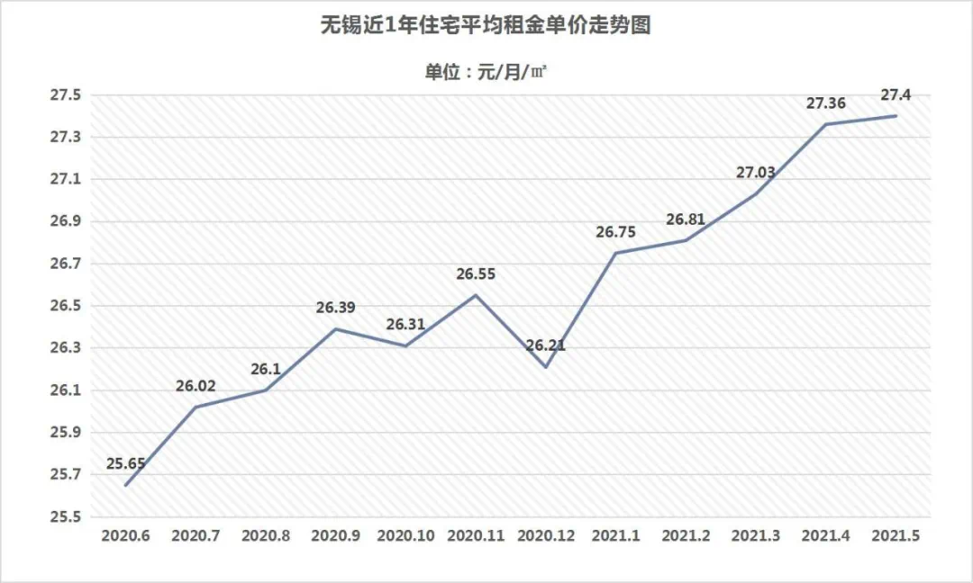 具体到无锡来看,无锡平均租金单价从2020年6月的25.65元/月/㎡上涨到了今年5月的27.4元/月/㎡,单价上涨了1.75元/月/㎡,涨幅达到了6.8%(数据含江阴、宜兴)。