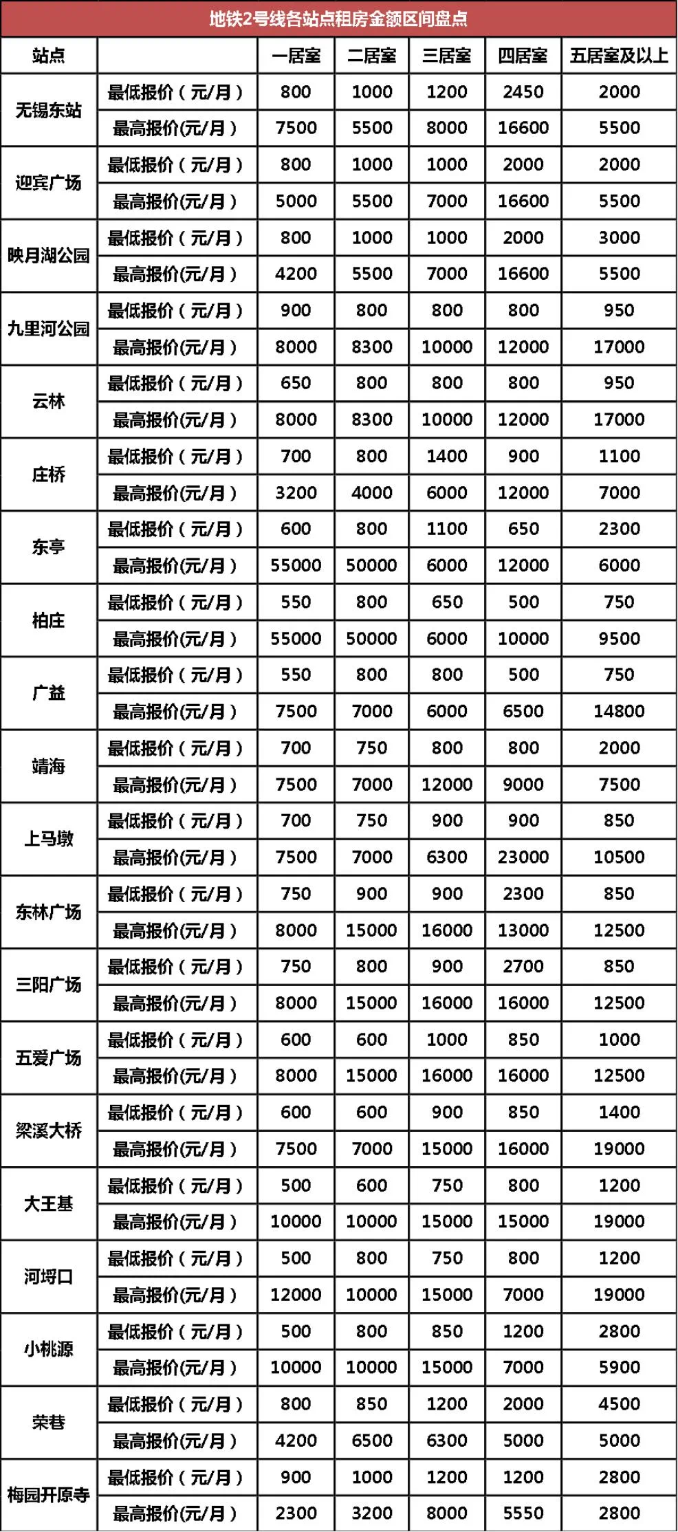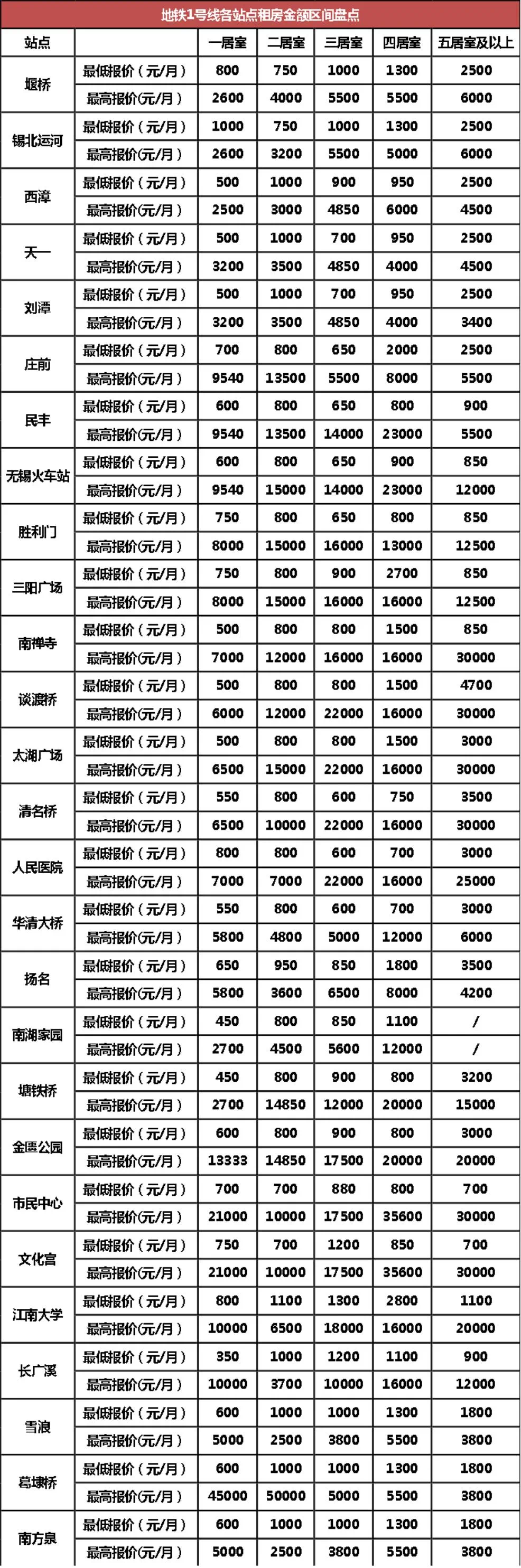 除了行政区外,租房还需要注重一大要素,那就是交通,对无锡来说,比较方便的公共出行方式依然还是地铁,因此小编统计了无锡3条地铁线路各站点租房的门槛与天花板价格,仅供参考(数据来源于诸葛找房,具体以房东报价为准)。