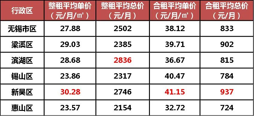 各行政区中,整租平均单价方面,新吴区以30.28元/月/㎡的单价拔得头筹,但是整租均价总价较高的是滨湖区,达到了2836元/月。合租方面,新吴区在平均单价和平均总价2项数据中均位列榜首,其中合租平均单价为41.15元/月/㎡,合租平均总价为937元/月。