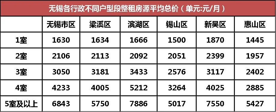 按照不同户型来看,无锡市区一居室整租房源平均总价为1630元/月,二居室平均总价为2106元/月,三居室平均总价为3050元/月,四居室平均总价为4233元/月,5居室及以上平均总价6843元/月。