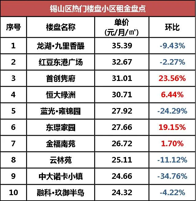 锡山区5月平均租房单价为25.46元/㎡/月,环比上涨1.4%。其中位于锡东新城的龙湖九里香醍是锡山区平均租金单价较高的小区,达到了35.39元/㎡/月。