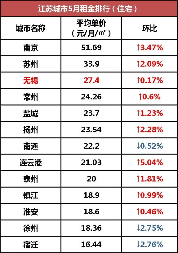 中国城市租赁价格指数在连续两个月小幅上涨后,4月份该指数再次回落。但是根据统计,无锡的住宅出租价格并未发生下滑。根据全国房价行情网站显示,无锡5月住宅租金平均单价约27.4元/月/㎡,环比上涨0.17%,租金平均单价在江苏位列第三,仅次于南京以及苏州。