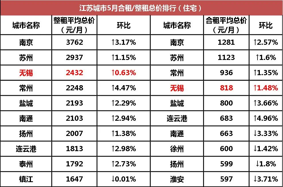 随后小编还统计了江苏部分城市整租以及合租的平均总价排行。整租排行榜中,无锡以2432元/月的整租平均总价依然位列全省第三,仅次于南京和苏州,环比上涨0.63%;合租排行榜中,无锡以818元/月的平均总价位居全省第四。