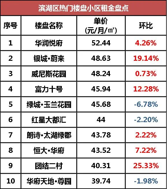 随后小编也统计了无锡各行政区租金相对较高的小区。滨湖区5月平均租房单价为29.24元/㎡/月,环比上涨1.46%。其中华润悦府是滨湖区平均租金单价较高的小区,达到了52.44元/㎡/月。其他的一些品牌楼盘如朗诗太湖绿郡、绿城玉兰花园等也都榜上有名。