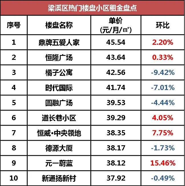 梁溪区5月平均租房单价为29.51元/㎡/月,环比下降0.46%。其中鼎牌五爱人家是梁溪区平均租金单价较高的小区,达到了45.54元/㎡/月。