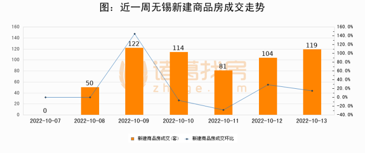 根据无锡市房地产市场管理和监测中心数据显示,2022年10月13日无锡新建商品房成交119套,较昨日增加15套,环比上涨14.4%