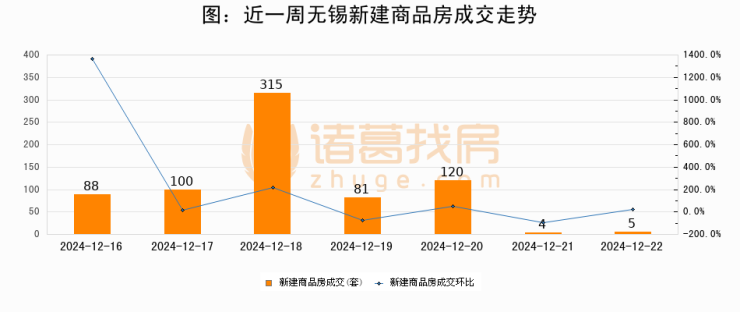 根据无锡市房地产市场管理和监测中心数据显示,2024年12月22日无锡新建商品房成交5套,较昨日增加1套,环比上涨25%