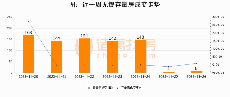 从存量房来看,2023年11月26日无锡存量房单日成交8套,比昨日增加4套,环比上涨100%。从近一周存量房成交来看,无锡存量房日均成交套数为109套,11月26日单日成交8套,低于近一周平均水平92.7%。