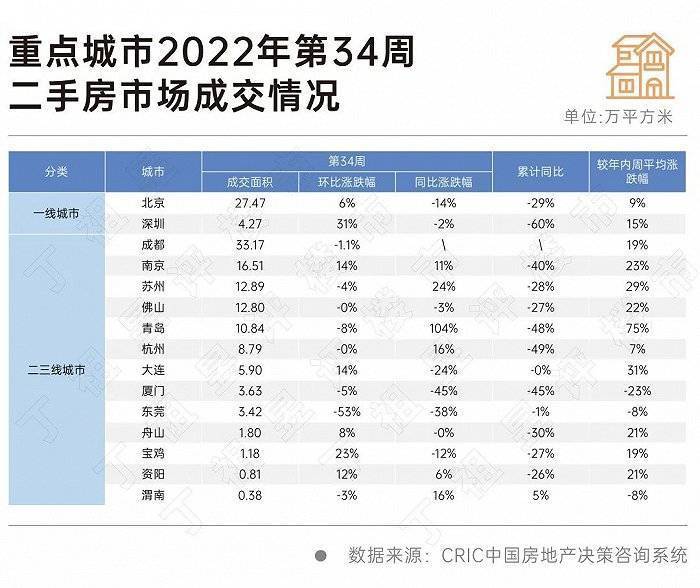 具体到城市来看,CRIC数据显示,第34周(8.15-8.21)15个重点城市中八成二手房成交面积较年内周平均上涨。