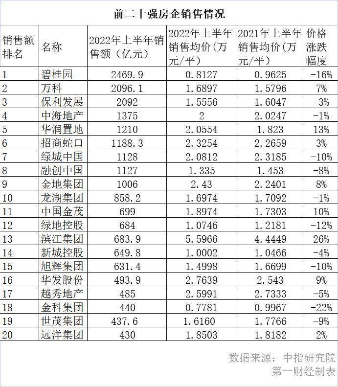 排名前列财经据中指研究院数据统计发现,2022年上半年,销售额排名前20的房企中,有12家的销售均价都出现不同程度的下跌,另外8家的销售均价上涨。