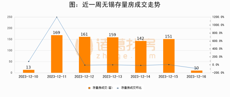 从存量房来看,2023年12月16日无锡存量房单日成交10套,比昨日减少141套,环比下降93.4%。从近一周存量房成交来看,无锡存量房日均成交套数为115套,12月16日单日成交10套,低于近一周平均水平91.3%。
