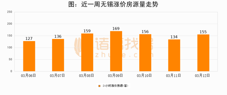 根据诸葛找房数据显示,无锡24小时涨价房源量为155套,较03月11日增加21套,环比上涨15.7%。与此同时,涨价房源占比小幅扩大,业主信心有所提升。