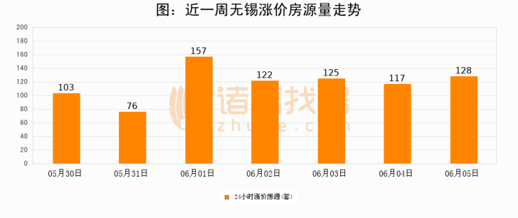 根据诸葛找房数据显示,无锡24小时涨价房源量为128套,较06月04日增加11套,环比上涨9.4%。与此同时,涨价房源占比小幅扩大,业主信心有所提升。