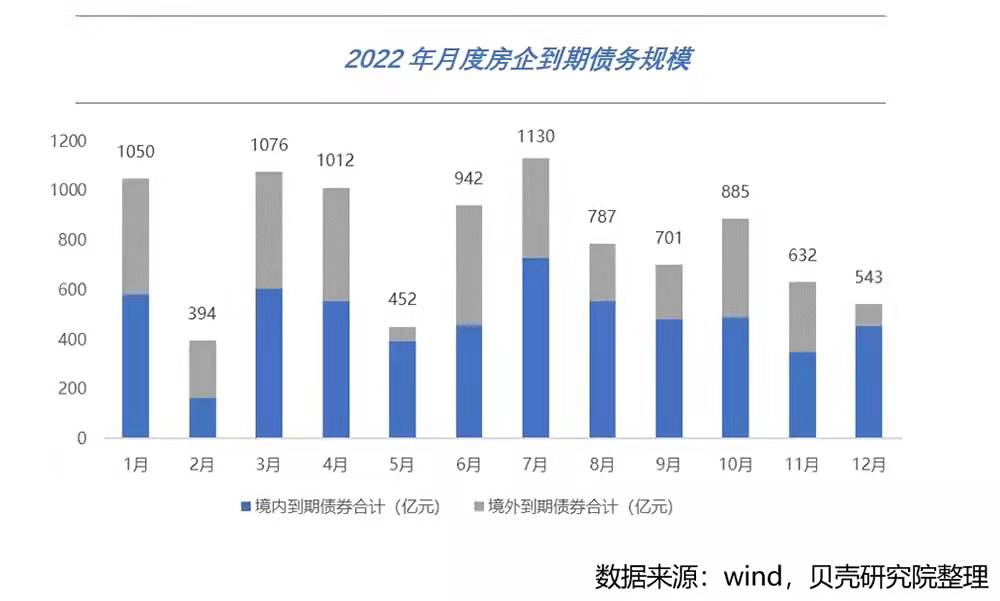 根据贝壳研究院统计,2022年房企预计到期债务约为9603亿元,比2021年下降约25%,但仍处于接近万亿的偿债规模高位。从2022年月度到期债务情况来看,房企偿债压力集中在1月、3月、4月、7月,以上四个月的偿债规模超过千亿元,这将使部分房企在短时间面临较大偿债考验,对房企在该节点的资金筹措、销售回款、工程进度等方面都提出较高要求。