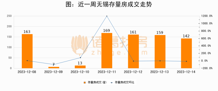 从存量房来看,2023年12月14日无锡存量房单日成交142套,比昨日减少17套,环比下降10.7%。从近一周存量房成交来看,无锡存量房日均成交套数为116套,12月14日单日成交142套,高于近一周平均水平22.4%。