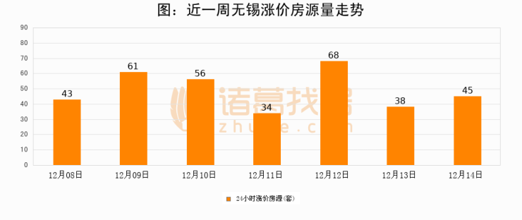 根据诸葛找房数据显示,无锡24小时涨价房源量为45套,较12月13日增加7套,环比上涨18.4%。与此同时,涨价房源占比小幅扩大,业主信心有所提升。