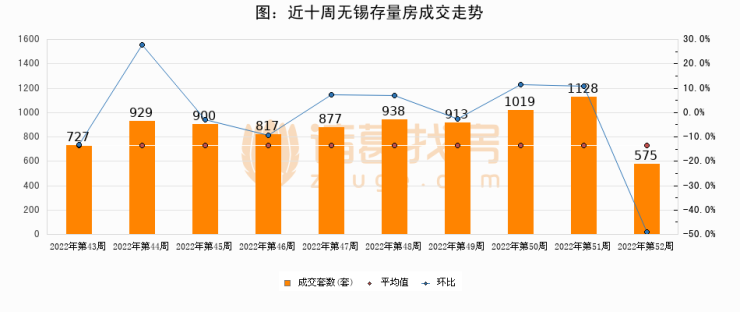 存量房方面,第52周无锡存量房成交575套,较上周减少553套,环比下降49%。从近十周成交走势来看,周均成交套数为882套,本周低于平均水平34.8%。