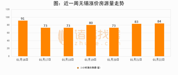根据诸葛找房数据显示,无锡24小时涨价房源量为84套,较01月21日增加1套,环比上涨1.2%。与此同时,涨价房源占比小幅扩大,业主信心有所提升。