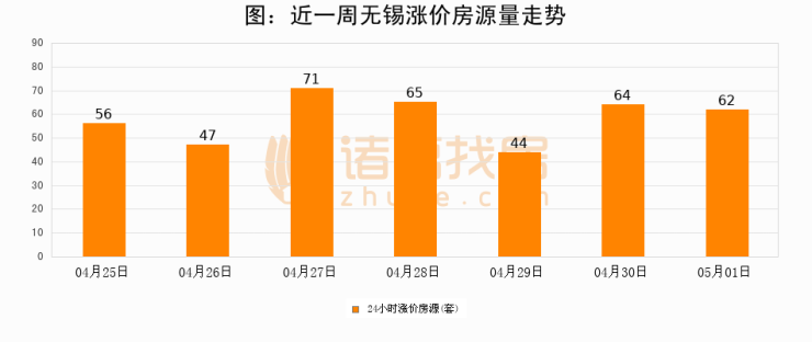根据诸葛找房数据显示,无锡24小时涨价房源量为62套,较04月30日减少2套,环比下降3.1%。与此同时,涨价房源占比小幅回落,对于购房者来说是一个入市窗口期,购房者可抓住时机入市。