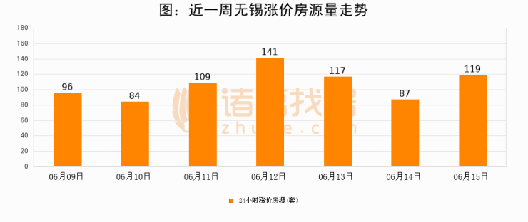根据诸葛找房数据显示,无锡24小时涨价房源量为119套,较06月14日增加32套,环比上涨36.8%。与此同时,涨价房源占比小幅扩大,业主信心有所提升。