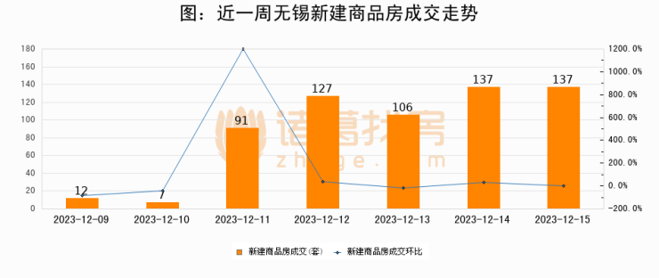 根据无锡市房地产市场管理和监测中心数据显示,2023年12月15日无锡新建商品房成交137套,较昨日持平