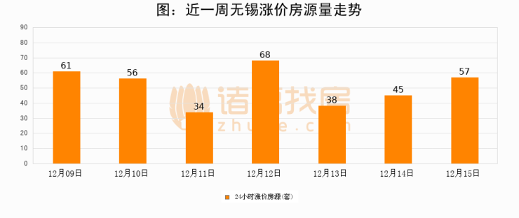 根据诸葛找房数据显示,无锡24小时涨价房源量为57套,较12月14日增加12套,环比上涨26.7%。与此同时,涨价房源占比小幅扩大,业主信心有所提升。