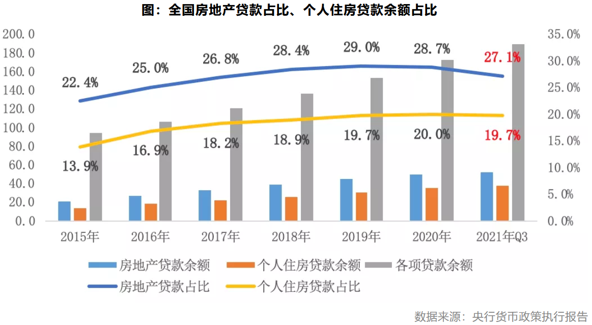 2021年三季度末,全国房地产贷款余额51.4万亿元,占各项贷款余额的比重进一步回落至27.1%,较2020年末再降1.6个百分点。其中,个人住房贷款余额37.4万亿元,占各项贷款余额的比重跌至19.7%,较2020年末减少0.3个百分点。