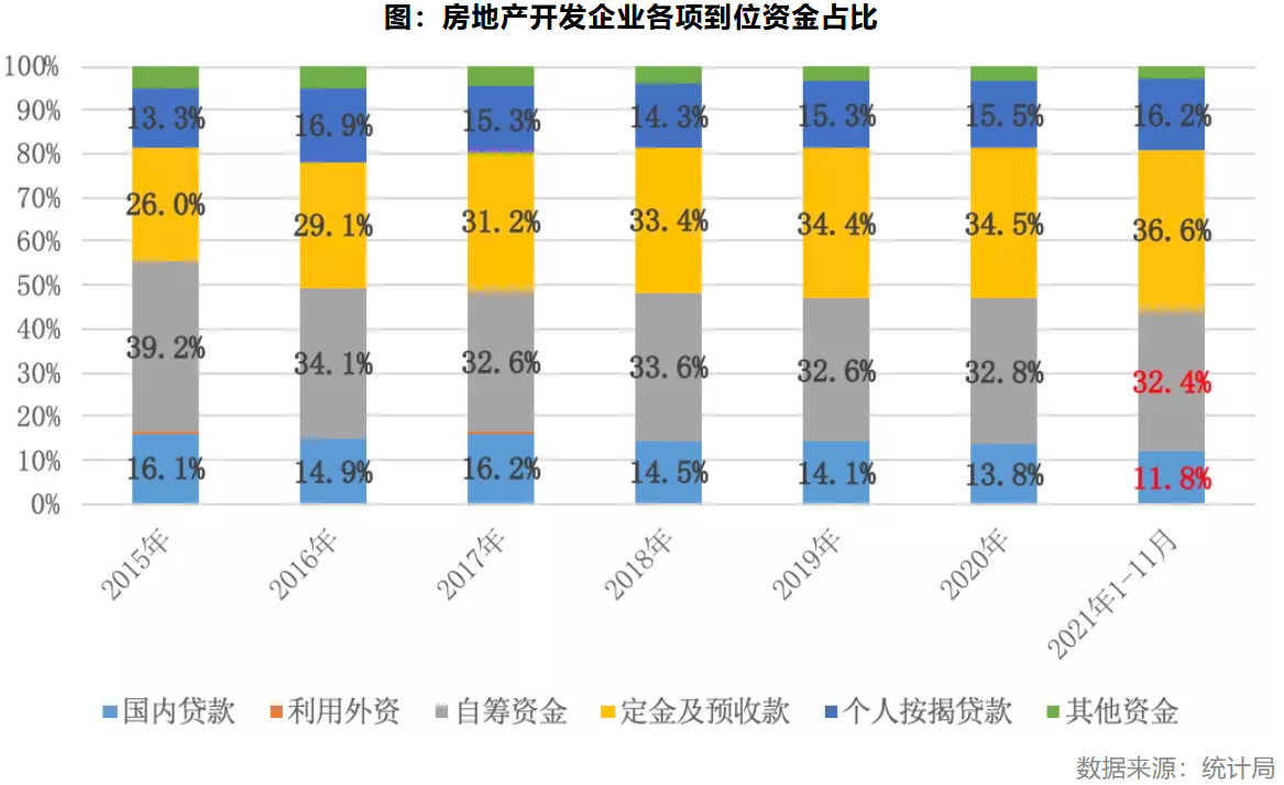 据统计数据显示,2021年1-11月,房地产开发企业到位资金183362亿元,同比增长7.2%。其中,国内贷款、自筹资金占比分别跌至11.8%和32.4%,较2020年末分别减少2个百分点和0.4个百分点。反观定金及预收款、个人按揭贷款占比分别升至36.6%和16.2%,较2020年末分别增加2.2个百分点和0.6个百分点。说明国内贷款、自筹资金增长显著受限,定金及预收款、个人按揭贷款渐成房企最为重要的资金渠道来源,企业对销售回款的依赖度持续提升。