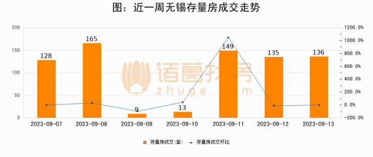 从存量房来看,2023年09月13日无锡存量房单日成交136套,比昨日增加1套,环比上涨0.7%。从近一周存量房成交来看,无锡存量房日均成交套数为105套,09月13日单日成交136套,高于近一周平均水平29.5%。