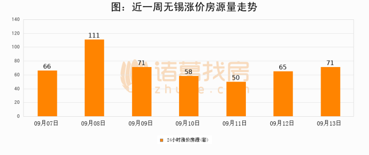 根据诸葛找房数据显示,无锡24小时涨价房源量为71套,较09月12日增加6套,环比上涨9.2%。与此同时,涨价房源占比小幅扩大,业主信心有所提升。