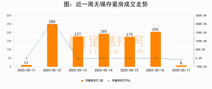 从存量房来看,2025年05月17日无锡存量房单日成交8套,比昨日减少197套,环比下降96.1%。从近一周存量房成交来看,无锡存量房日均成交套数为145套,05月17日单日成交8套,低于近一周平均水平94.5%。