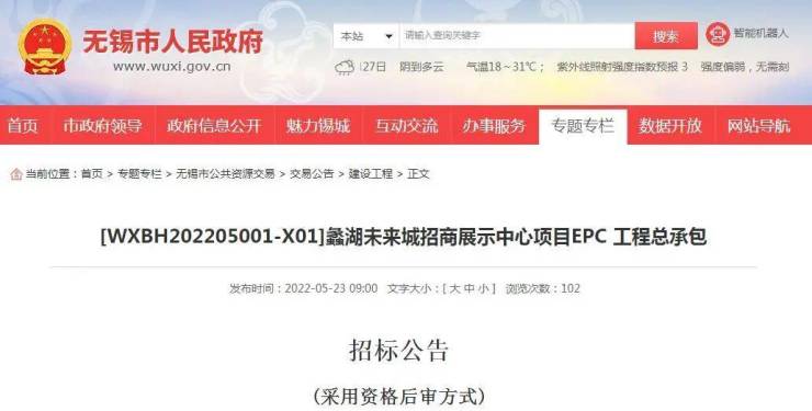 无锡官网公布蠡湖未来城招商展示中心项目招标公告!