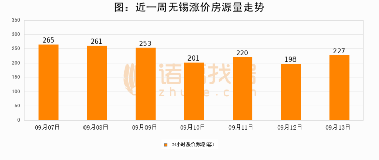 根据诸葛找房数据显示,无锡24小时涨价房源量为227套,较09月12日增加29套,环比上涨14.6%。与此同时,涨价房源占比小幅扩大,业主信心有所提升。
