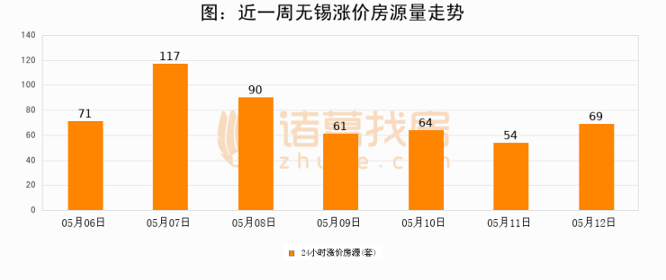 根据诸葛找房数据显示,无锡24小时涨价房源量为69套,较05月11日增加15套,环比上涨27.8%。与此同时,涨价房源占比小幅扩大,业主信心有所提升。
