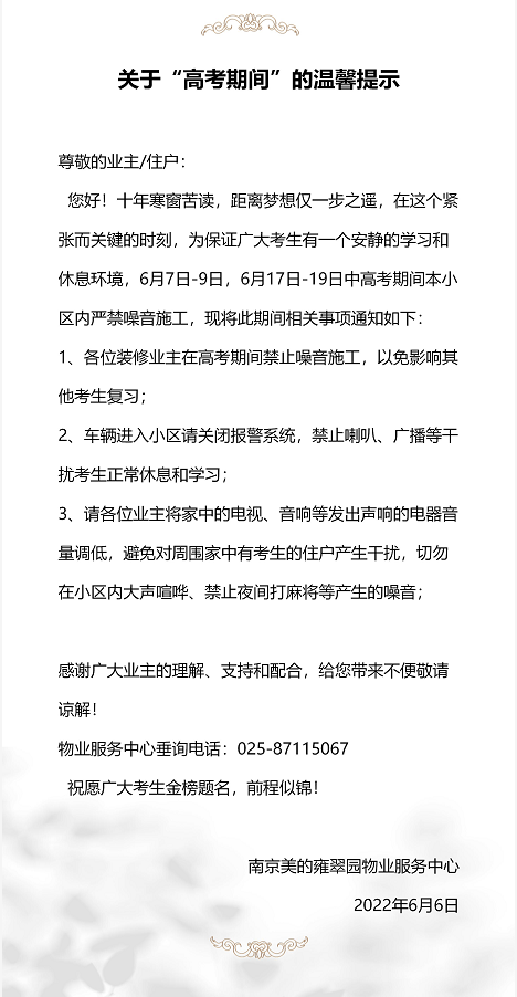 在江苏南通美的弘阳君兰天悦,4号早上7点,美置服务人员就已经对小区楼宇、消防、电梯等设施设备进行安全大排查,5月开始,美的置业沪苏皖区域就开始增加安全检修的频率,进一步将安全隐患消除在萌芽状态,确保设施设备高考期间正常运行。除安全检查外,美置服务提供服务的所有小区,3日至9日期间,禁止一切有声施工作业,物业服务中心将对所有装修单位及个人进行施工管控,为学子们提供一个安静的学习氛围。
