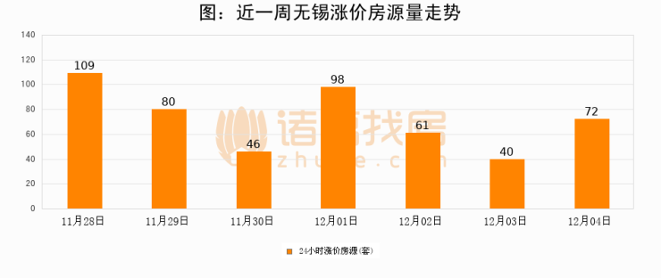 根据诸葛找房数据显示,无锡24小时涨价房源量为72套,较12月03日增加32套,环比上涨80%。与此同时,涨价房源占比小幅扩大,业主信心有所提升。
