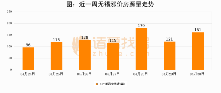 根据诸葛找房数据显示,无锡24小时涨价房源量为161套,较04月29日增加40套,环比上涨33.1%。与此同时,涨价房源占比小幅扩大,业主信心有所提升。