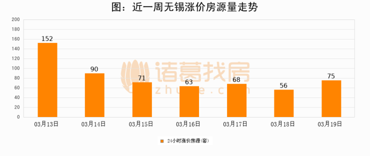 根据诸葛找房数据显示,无锡24小时涨价房源量为75套,较03月18日增加19套,环比上涨33.9%。与此同时,涨价房源占比小幅扩大,业主信心有所提升。