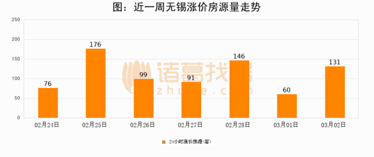 根据诸葛找房数据显示,无锡24小时涨价房源量为131套,较03月01日增加71套,环比上涨118.3%。与此同时,涨价房源占比小幅扩大,业主信心有所提升。