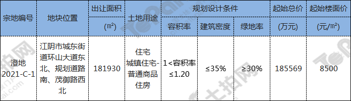 4月12日,江阴市自然资源和规划局挂牌澄经告字(2021)8号公告,出让敔山湾板块澄地2021-C-1号地块,起始总价18.56亿元。