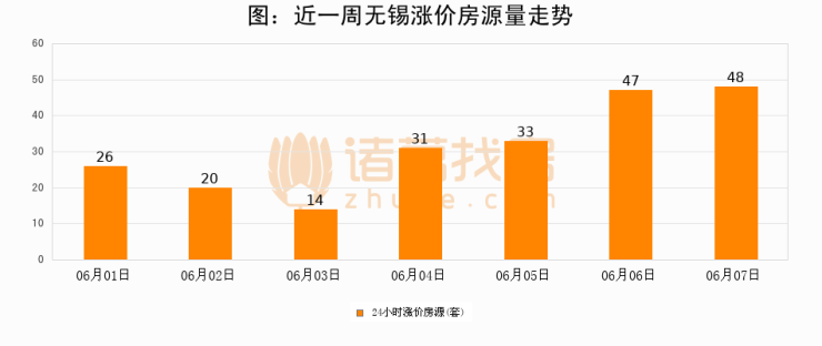 根据诸葛找房数据显示,无锡24小时涨价房源量为48套,较06月06日增加1套,环比上涨2.1%。与此同时,涨价房源占比小幅扩大,业主信心有所提升。