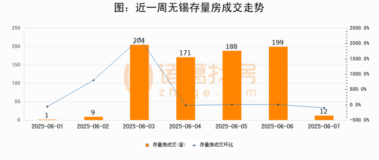 从存量房来看,2025年06月07日无锡存量房单日成交12套,比昨日减少187套,环比下降94%。从近一周存量房成交来看,无锡存量房日均成交套数为112套,06月07日单日成交12套,低于近一周平均水平89.3%。