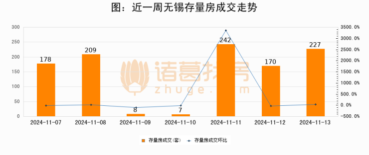 从存量房来看,2024年11月13日无锡存量房单日成交227套,比昨日增加57套,环比上涨33.5%。从近一周存量房成交来看,无锡存量房日均成交套数为148套,11月13日单日成交227套,高于近一周平均水平53.4%。