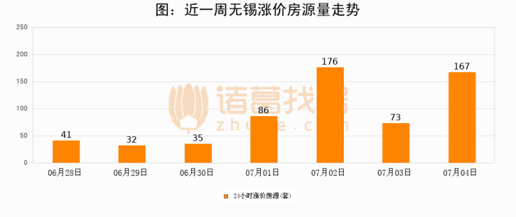 根据诸葛找房数据显示,无锡24小时涨价房源量为167套,较07月03日增加94套,环比上涨128.8%。与此同时,涨价房源占比小幅扩大,业主信心有所提升。